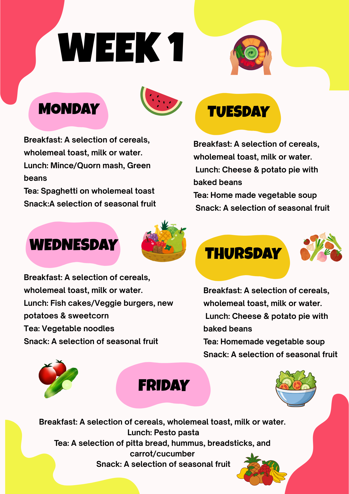 Our cook prepares, three fresh home cooked meals a day. We have a two week meal plan, which offers healthy and nutritious meals (see below).